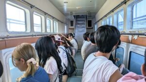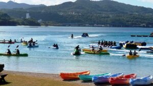 今日はマリン体験と選択別体験を午前・午後で理系・文系を入れ替えて実施。マリン体験はバナナボートやカヌー(シー・カヤック)など。