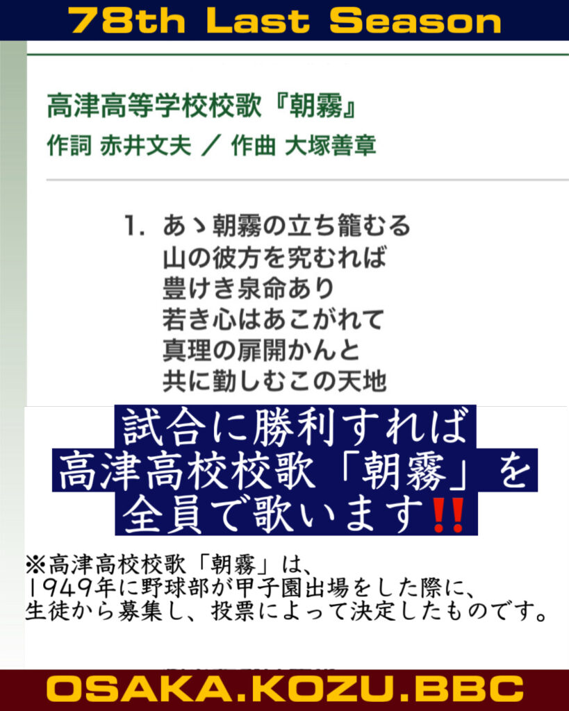 昨年の黒土搬入・LEDライトの設置を始め、長年現役生の活動に、多大なるご理解とご支援をいただいております。また公式戦会場にもお越しいただき、現役世代に力強いバックアップをしていただいてます。これまでの沢山のOBの皆様の伝統を絶やすことなく、これからももっともっと良い野球部が続きますよう、現部員・スタッフ一丸となって、昔と変わらぬ熱い気持ちで、高津高校グラウンドで白球を追いかけていきたいと思います。引き続き応援のほど、よろしくお願いいたします。