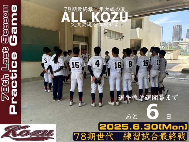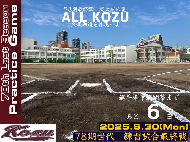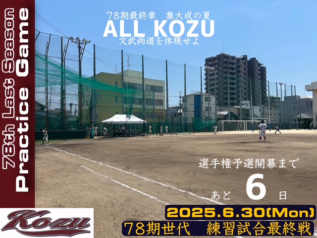 6月28日(土)、29日(日)は高津グラウンドにて、78期世代最後の練習試合を行い、公式戦を想定した布陣で、2日とも勝利することができました。この1年沢山の学校にお世話になりました。この3月まではマネージャー入れて部員13名で戦っていましたので、苦労も沢山ありましたが、本当によくここまで頑張ってくれました。