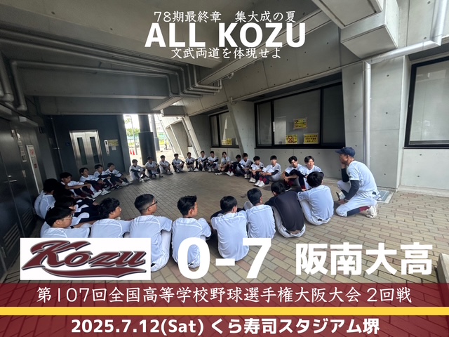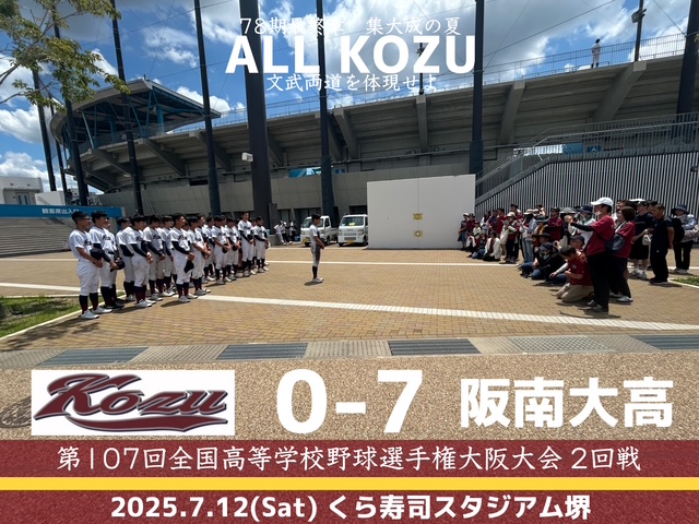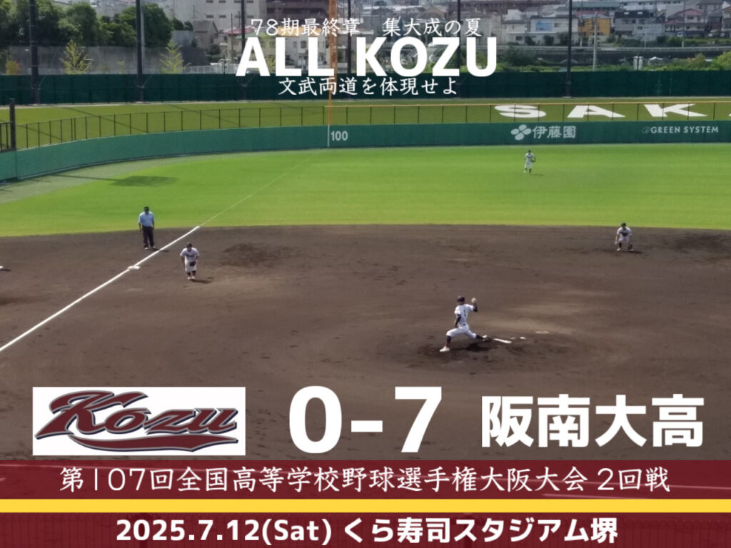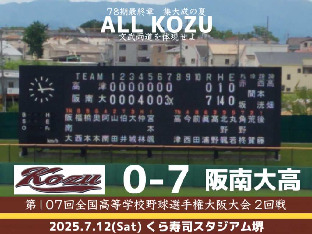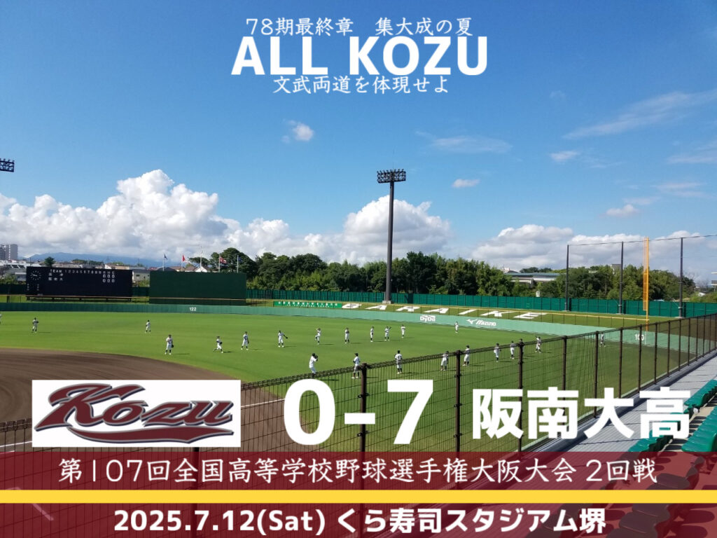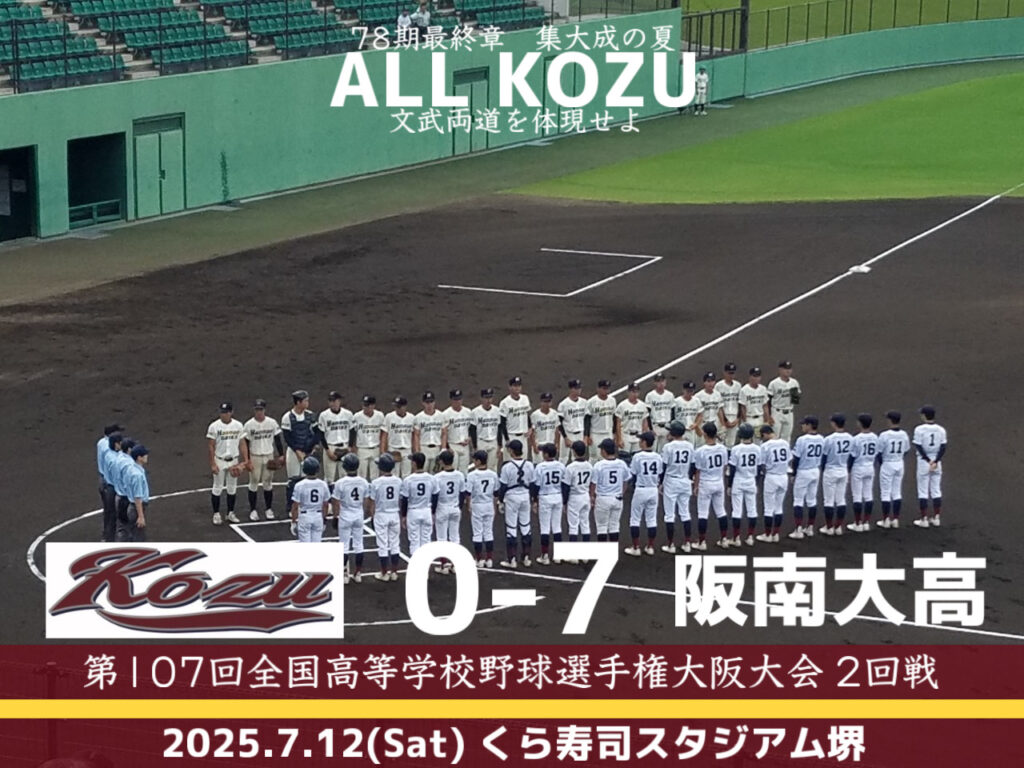 7月12日(土)にくら寿司スタジアム堺にて、選手権予選2回戦を戦い、阪南大高に0-7で敗退となりました。序盤3回までは0-0で進めるものの、4回に連打と味方の守備のミスにつけ込まれ、ビッグイニングを作られてしまい、苦しい展開になりました。打線で援護したい所ではありましたが、最後まで相手の主戦投手を打ちきれず、7回に再び連打を浴びてしまいました。