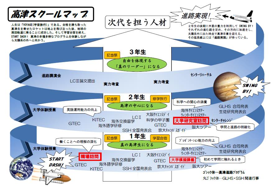 本校で行っている学習活動の多くは、カリキュラムはもちろんのこと、進路行事、学校行事、GLHSやSSHのプログラムの全てが、生徒の進路実現に向けて計画され、互いに密接に関連している。