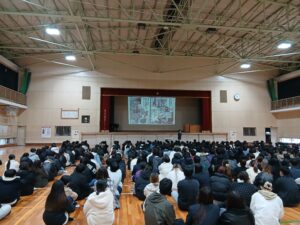 本日で、後期期末考査も終了。これで今年度の授業、考査はすべて終了!・・・と、気持ちよく好きなことができる、と思ったのもつかの間、2年生は体育館で学年集会を開催。学年主任からしっかりと伝わるメッセージを放った。