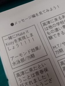 「Make it Kozy!」は、高津でしかできないことを見つけたほしい。何か自分の色を出してほしい、そして「高津生らしく行こうぜ!」という私の造語。生徒への説明の際、「まだまだ浸透してないから、みんなが浸透させてくれ!」と話したが、自治会制作のペンフレットの先輩からのメッセージ編に「一緒にMake it Kozy!を実現しましょう!とあって嬉しかった。Thank you!先輩!
