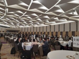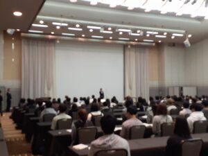 ホテル到着間際は、「えー、めちゃでかい」「このホテル泊まるん?」と口々に喜びの声が。あらためてホテルの立派さを実感しつつ、全体会場に集合し、開講式。挨拶で、3年後共通テストを見据え、こういう大きな会場で学ぶこと、受験は団体戦であるということ、人生は逆算すべきであるということ、明日の確認テストでは全員で100点を取るということ、そして、学年全体の絆を深めることを伝えた。