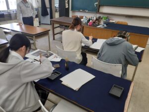 放課後、書道室では2年生2名と1年生1名が集中して書写中。1年生は経験者でなかなかスマートで美しい字を書く。現在、新入部員はその1名のみ。心落ち着き、字も美しくなる書道部へぜひ!