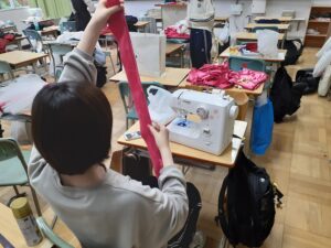「任せといてくださいよ!」と、尋ねてもいないのにクラスのまとめ役2名が自信満々で返してくる。聞くと、ユニフォームの方も着々と進んでおり、完成間近だという。教室でのユニフォーム制作の様子も伺うと、話していた通り、見事に数人分が完成している。身に着けた写真も見せてくれたが、なかなかのクオリティ。「早いなぁ、さすが3年やな。」と言うと、「そうでしょ、勉強もしないといけないので!」と、受験生の自覚もチラリ。こういうところが計画や段取りに出てくるのだと実感。