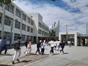 本日は、地震を想定した防災避難訓練。5限終わりに「地震です!」の放送により、訓練を開始。教室では、生徒たちは机の下に隠れる。特に必ず頭を守ること。また、机のぐらつき、移動を防ぐため机の足は角をしっかり持つ。私は直接その様子を見ていないが、公式Instagramでは、皆しっかりと適切に防災している様子が見える。教員はというと、下に空きスペースのない教卓のため頭を隠すことができない。ゆえに、各教室備え付きの簡易ヘルメットを使用する。ぐっと力を入れるとパカッと開いて被れるようになっている。地震が収まれば折りたたんで何度も使用できる優れモノだ。