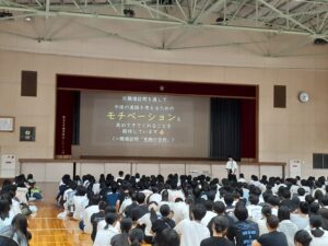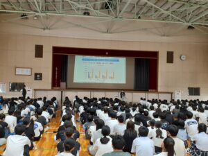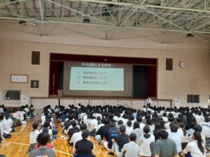 集会の最後は、この土曜日にある「進研模試」への臨み方と来る夏休みの過ごし方。厳しい暑さにも心折れずに精進しよう。今が伸び時、高津生!