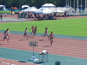 2年男子100mには、T選手とK選手が出場。T選手はタイムがよかったので決勝進出の可能性があると思ったが、惜しくも進出を逃す。二人とも善徳で走る姿は素晴らしかった。