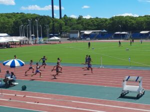 1年女子走幅跳には、S選手が出場。順番に試技が行われていたが、部員からは予選2位通過と聞いたが、確認できず、また本人とは会えず残念。100mは、出場選手のアナウンスもあったので、わかりやすかった。トラック競技とフィールド競技の違いかもしれないが、砲丸投げや走高跳も同時進行なので、アナウンスがあれば応援しやすいなと感じた。