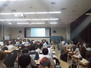 本格的な夏休みに入っても、高津高校は各教室から熱気あふれる会話が聞こえてくる。4階視聴覚室は、3年生の数学補習で超満員。一度に対応できる生徒数を大幅に超えているが、生徒たちのやる気に意気を感じ、多大なるエネルギーを持って教えている。生徒たちも真剣そのもの。入り口の外にいる私の気配を感じないぐらいに集中している。が、写真をとろうとすると、さすがに気配を感じたのか、男子4人が後ろを振り返る。ニコッと爽やかな笑顔だけを送ったあとは黒板に集中。やるときゃやるよ、高津生!