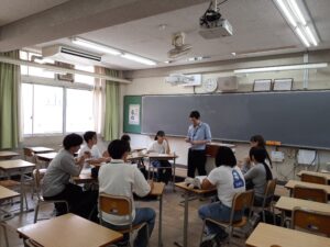 1年生の教室では、本日より「KITEC(Kozu Intensive Training of English Communication )」、通称カイテックが始まった。1年生の『基礎コース』は、学年9クラスを3日に分け、一日3クラス全員が登校。1班6~10人でネイティブの方との交流を通して、英語での実践的コミュニケーション能力の育成を図るとともに、英語学習に対する意欲を高めている。