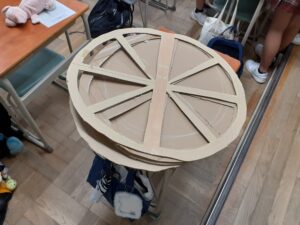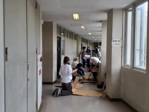そのなかで、車輪だろうか、ある部品を作り始めているクラスも。あえて何かは聞かなかったが、皆一生懸命作業している。また、廊下で段ボールを広げてものづくりしているクラスがある。これだけたくさんの段ボールを収集するのも大変だが、すでに済ませているのは素晴らしい。「何を作るんかな?」と聞くが、「それは当日のお楽しみです」と焦らしてくれる。まぁ楽しみにしておく。