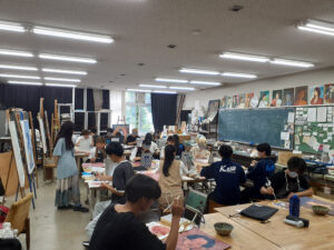 さて、本日1限は「美術」の授業を見学。テーマは『自画像』。一人ひとりに割と大きな鏡が配置され、自らを細かに観察して描いている。生徒に聞くと、取り組み始めて3時間目にあたるらしい。皆、すでに下書きが終了し色を塗り始めている。それでもスピードには結構差があり、一通り全体が完成しつつある生徒もいれば、まだ輪郭を辿っている生徒もいる。当然、力量にも表現方法にも差が見られ、見た瞬間、目を見張るような作品もあるし、デフォルメが激しくイラスト風に描いているものもある。それも個性と見ていて楽しい。私が見回るのみ気にせず、一心不乱に真面目に取り組んでいるのが素晴らしい。出来上がりが楽しみだ。