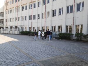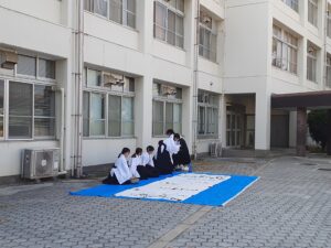 目線を帰ると、同じく中庭で書道部が書道パフォーマンスの練習にチームで励んでいる。普段静かな部屋で一人で集中して取り組むことが多い書道部だが、文化祭では、部員それぞれのパートを、心を込めて文字で表現する。作品は当日のお楽しみだが、一人ひとりの真剣な表情が良い緊張感を生み、全員の思いのこもったメッセージが完成された。当日は、きっと観客の皆さんに、その思いが伝わるに違いない。