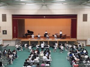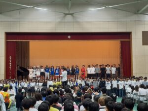 残念ながら中庭イベントはいったん中止。8時45分から、体育館でオープニングセレモニーが始まった。音楽選択者約100名の合唱「青い鳥」。授業で練習している姿も見ていたので、生徒たちの一生懸命に歌う姿に心が動く。目~と目~が合~うと上手に♪言~え~ない♪ との歌詞は、私のような人見知りには十分理解できる。「足りない言葉が胸を叩く」とは言い得て妙。広い空、かけがえのない未来、自分にとっての『青い鳥』は?本日の見た目は少々派手だが、生徒たち皆の真摯にひたむきに聴者に伝えようと歌う姿は、本日のオープニングにふさわしかった。良い時間をありがとう!
