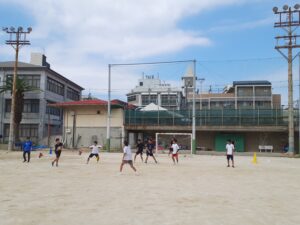 さて、そんな文化祭明けの暑い休日にも、部屋を出るとグラウンドにラグビー部とハンドボール部の動きが見える。そういえば、昨日のお茶会前にハンドボール部員のお母さんから「うちの子の写真は・・・」との一言を思い出し、グラウンドへ。皆、ボールに集中して声を出して頑張っている。お母さん、安心してください!写ってますよ。