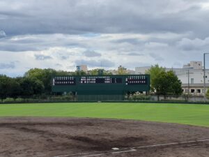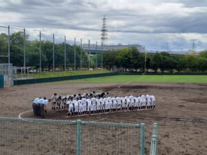 どんよりとした曇り空の下、硬式野球部の2回戦が北かわち皐ケ丘高校先攻で始まった。秋季大会は学校会場も多い中、夏の大会でも使用する久宝寺球場でできるのは良い経験。初回、先頭打者は少し詰まった難しい打球だったが、本校ショートが華麗にさばいてアウトをとる。先頭打者をきちんととるのは試合を有利に運ぶ条件の一つだ。
