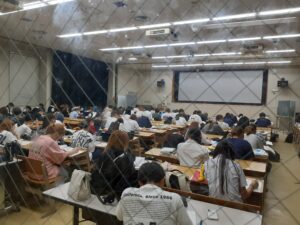 部活動に所属する生徒も、18時15分に部活を終え、18時15分から勉強に励むのがいつもの様子だが、一週間前となると、視聴覚室も満員である。今日は私も当番の一人として見回ると、皆集中モード。靴音を立てるのも憚るし、話しかけるのも気を遣うので、窓の外からパチリ。