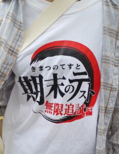 思わず写真を撮らせてもらった。「ダンス部何人かで揃えたので、まだ来ますよ!」と笑顔で教えてくれる。が、次がなかなか来ない。・・・ん、ちょっと待てよ。あのブラウンのパーカーを着た生徒のジッパーのわずかな隙間から見えるのは、白地に赤の円・・・あれは『期末』に違いない。すかさず、「それは『期末のテスト』やろ!」と指摘すると、「何でわかったんですか!?」と驚く。「私は見たらわかるんや」と、まるで鬼滅ファンのようなドヤ顔を見せてやった。