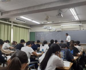 本日は、2年数学と1年・3年英語の授業を見学。数学のテーマは「複素数と方程式」だが、基本を抑えるために「剰余の定理」を確認。まだまだ暑い中、生徒への熱い語りに声量も高まる。その思いに応えつつ、生徒の一生懸命問題を解く姿は素晴らしい。ペアワークでは、得意な生徒が苦手な生徒に教えるシーンも珍しくない。教える方も教えられる方にも気づきがあり、良い学びの形だ。