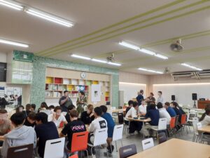 午後は、日本文化を体験していただこうと、先生方も一緒に「三線」を体験。たった1時間ではあったが、皆筋が良く、終わる頃には音階すべてをマスター。皆立派なドヤ顔を披露する。音楽のK先生も和やかなムードとGroenewaldo校の副校長の要望に応えて「なだそうそう」を弾き語り。ついつい皆でうっとりと聞き惚れてしまった。