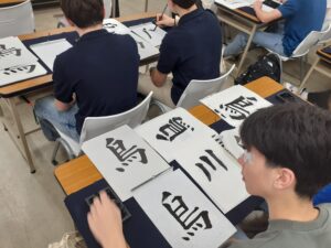 日本文化第2弾は「書道」。筆の毛に使用されている動物の説明や象形文字の説明など、脳をほぐした後、実践に入る。「山」「川」「鳥」を見本に生徒たちも集中して練習する。すぐに上手にかける生徒もいれば、苦心している生徒もいる。特に左利きの生徒には難しい。中には、上手くいかないので目先を変えて犬の絵やサインの練習をしている者もいる。さすがに先生方は真剣で、実に丈夫にとめやはねを表現されていた。