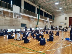 本日3年生のLHRは、人権学習の一環として、シッティングバレーを体験。昨年度も実施したが、足の不自由な方でも楽しめるスポーツとして、低いネットで体験。普段の動きとは異なるし、座ったまま限られた範囲でボールを操ることはやはり難しい。