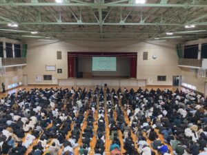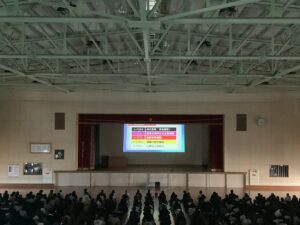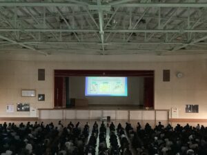 本日のLHRにて、防災教育を行いました。 全学年が体育館に集合し、地理の教員から講義を受けました。