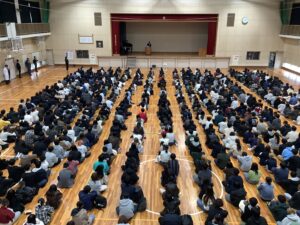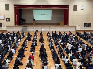 校歌斉唱後、校長による講話および「区役所×中学生プロジェクト」による「ももてんちゃん100周年バージョン」優秀作品に選出された生徒の紹介、生活指導部のお話、78期生お二人の合格体験のお話に熱心に聞き入っていました。